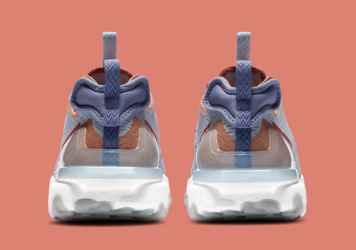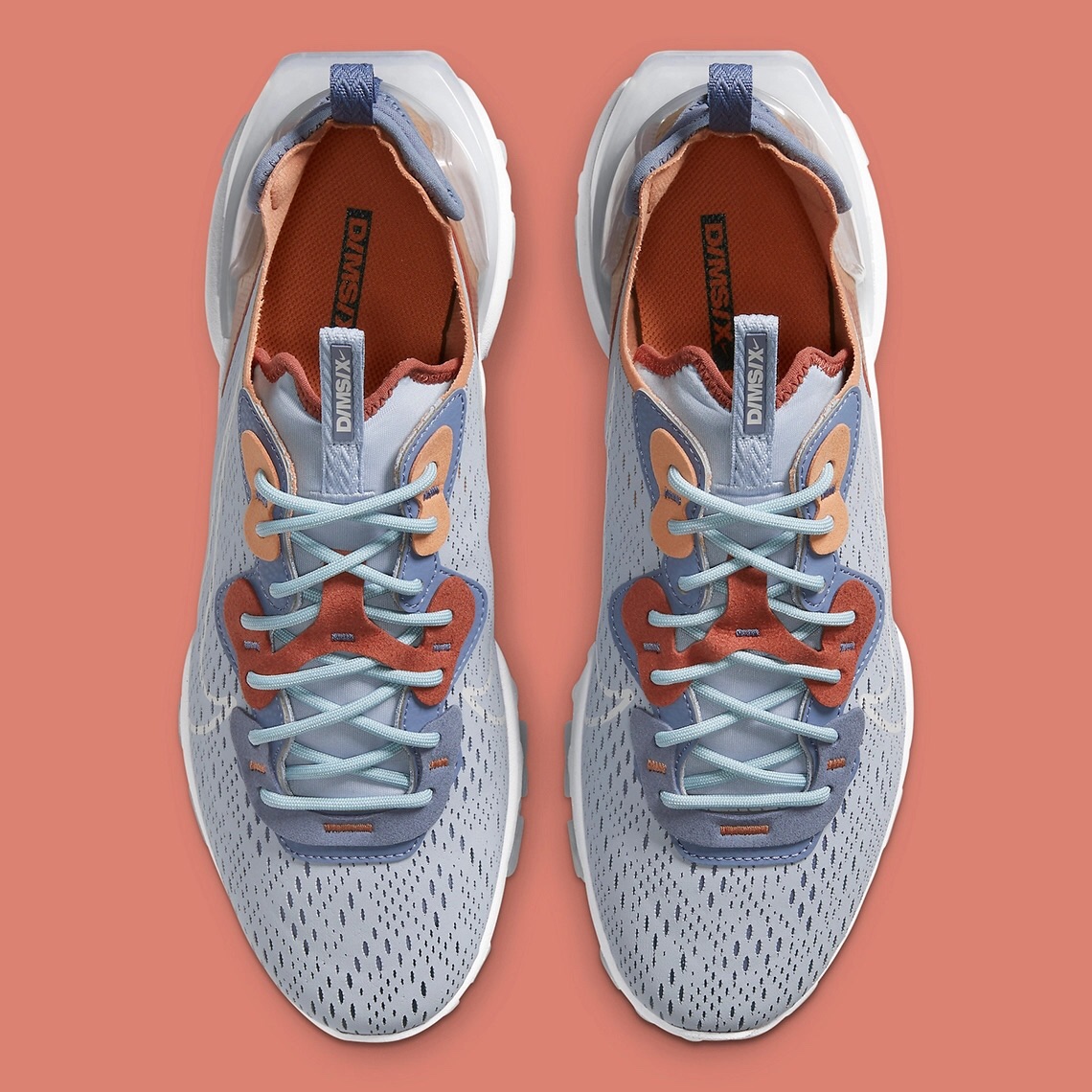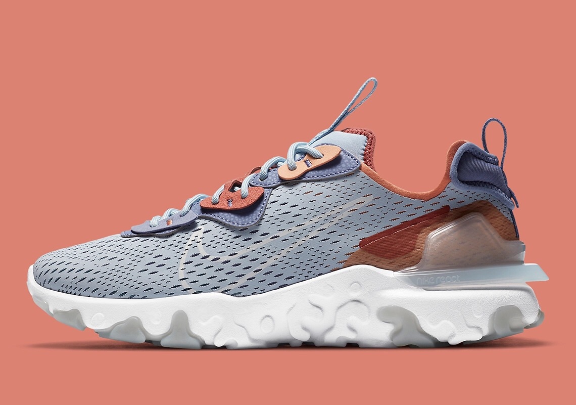 Nike React Vision is composed of mesh accents, and brutalist heel counter molds. It is debut in a simple “Light Armory Blue” variant. Amber brown dressing the lining, lace unit and black-placed taping. It is expected to arrive at Nike website soon.