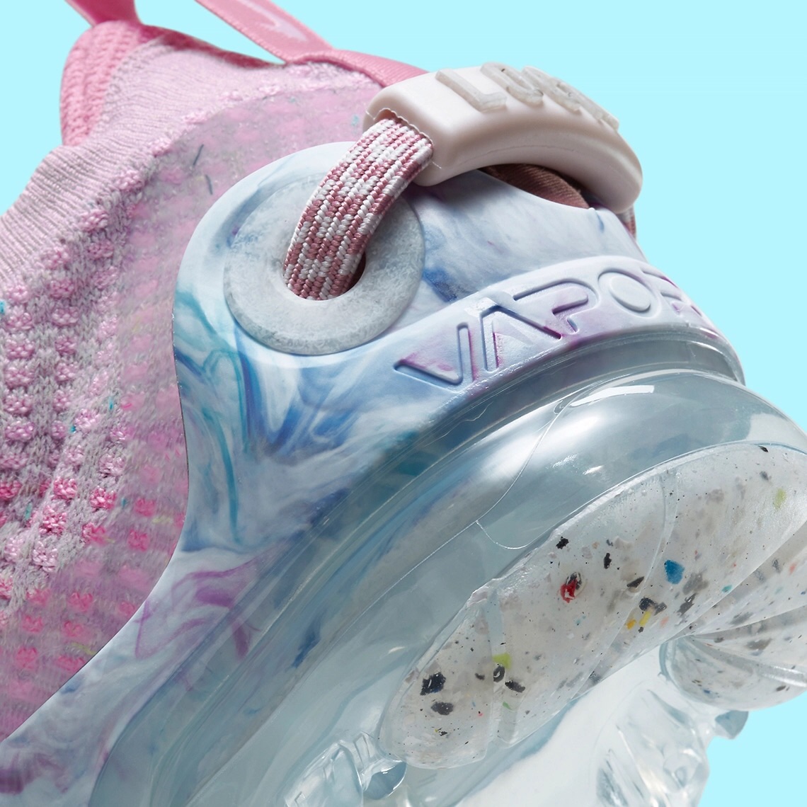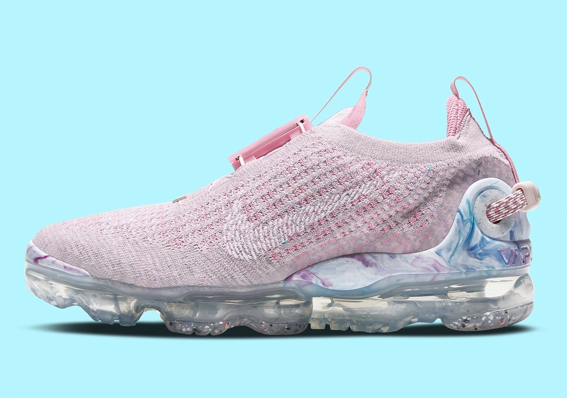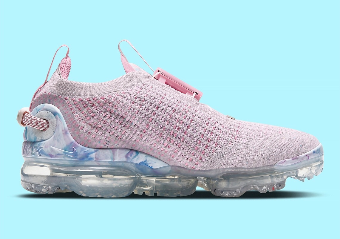 Nike Vapormax 2020 is now apppearing in many a bright colorway. The latest is “Light Arctic Pink” with sustainable design. Light shades are at the majority and FlyEase module on the tongue. Darker purples and complementing notes of blue work in weave as they marbled toe cap and counter which finish is coated in a light neutral.
