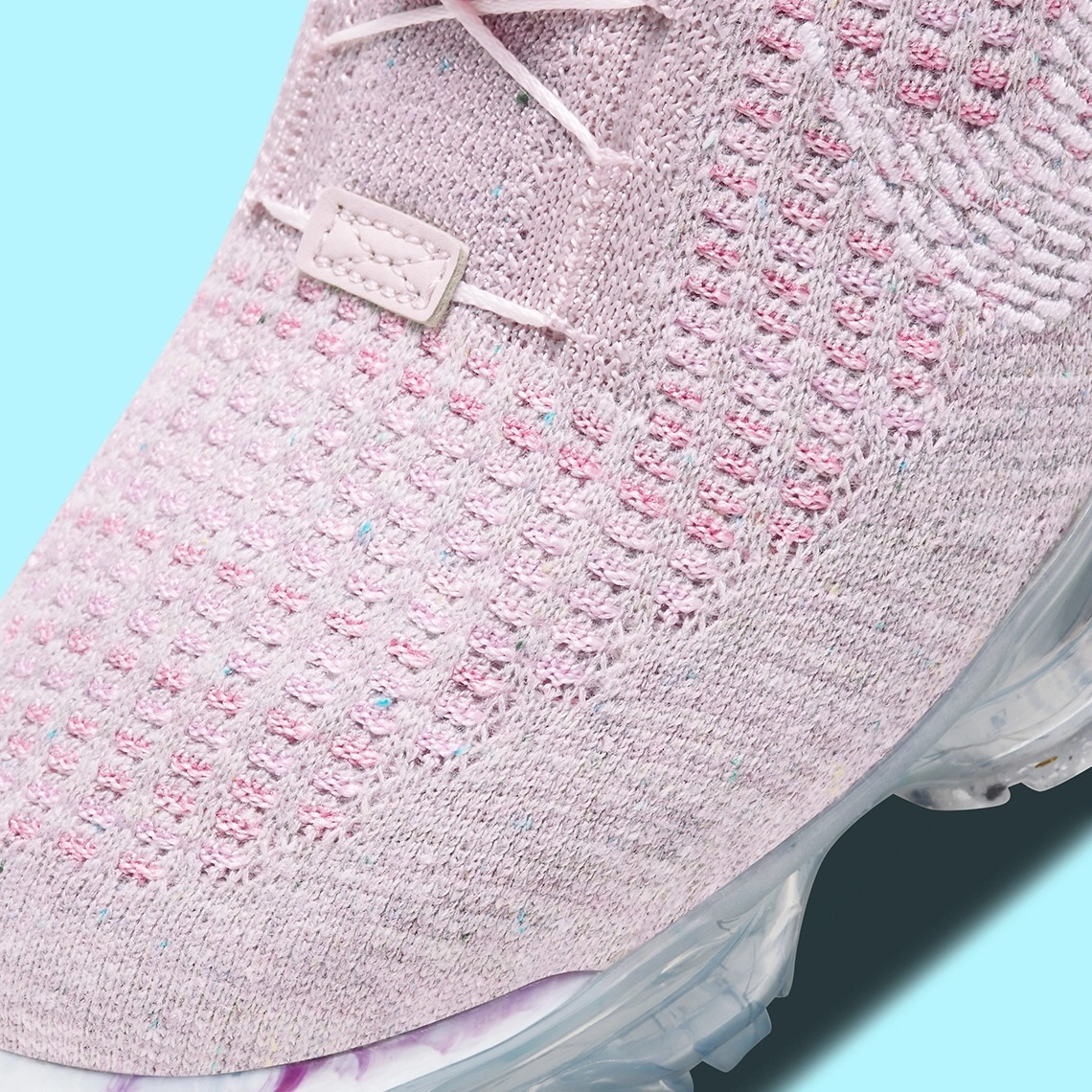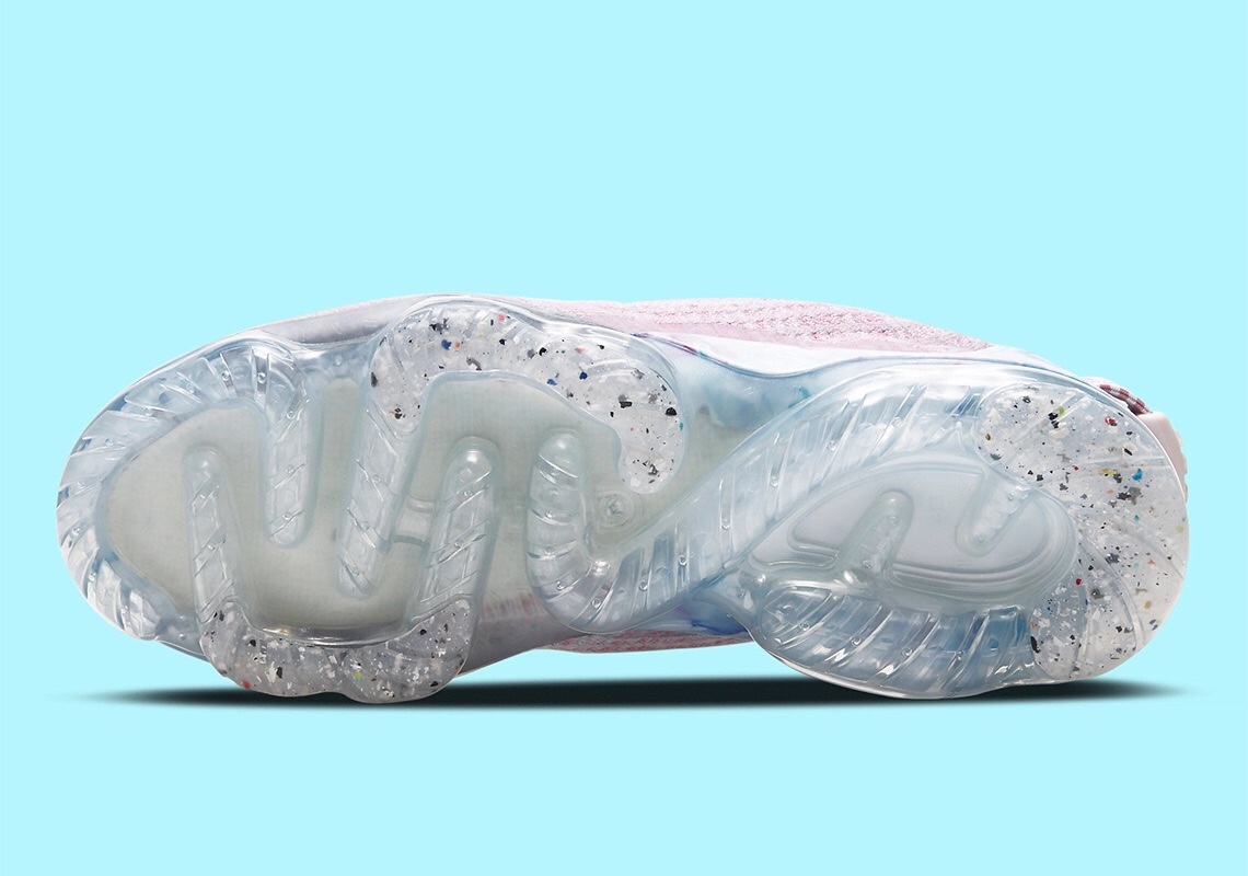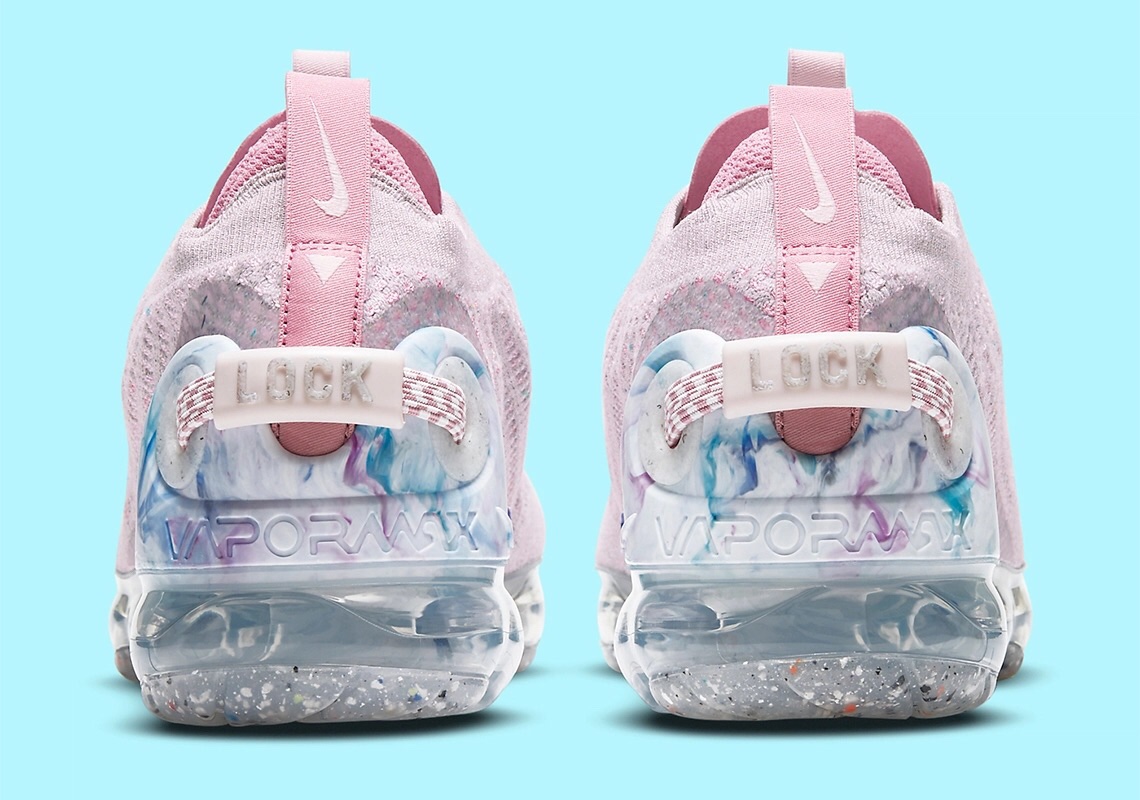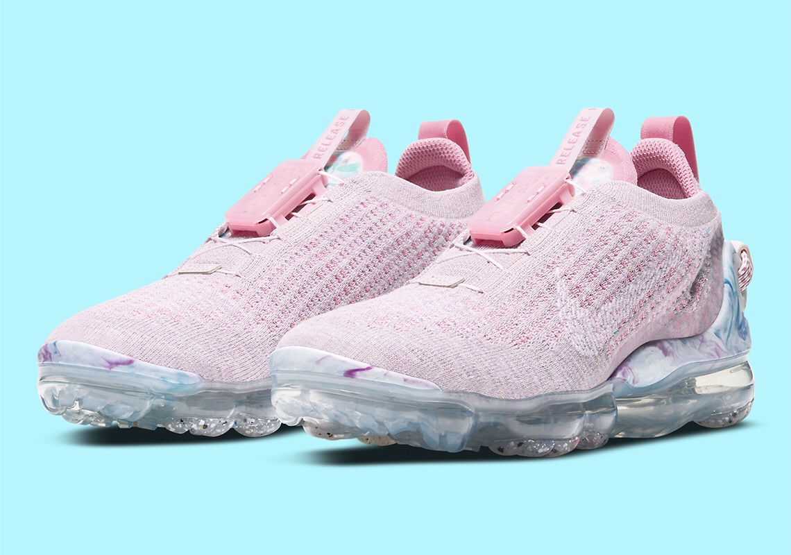 Nike Vapormax 2020 is now apppearing in many a bright colorway. The latest is “Light Arctic Pink” with sustainable design. Light shades are at the majority and FlyEase module on the tongue. Darker purples and complementing notes of blue work in weave as they marbled toe cap and counter which finish is coated in a light neutral.