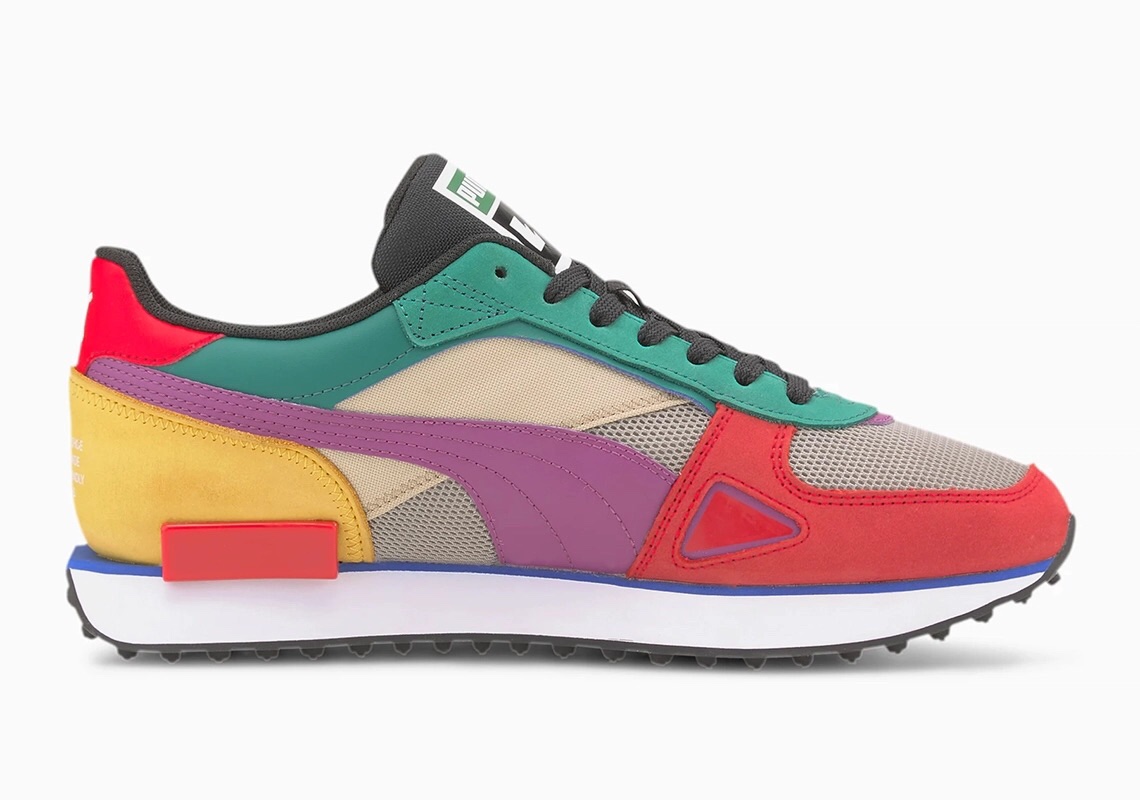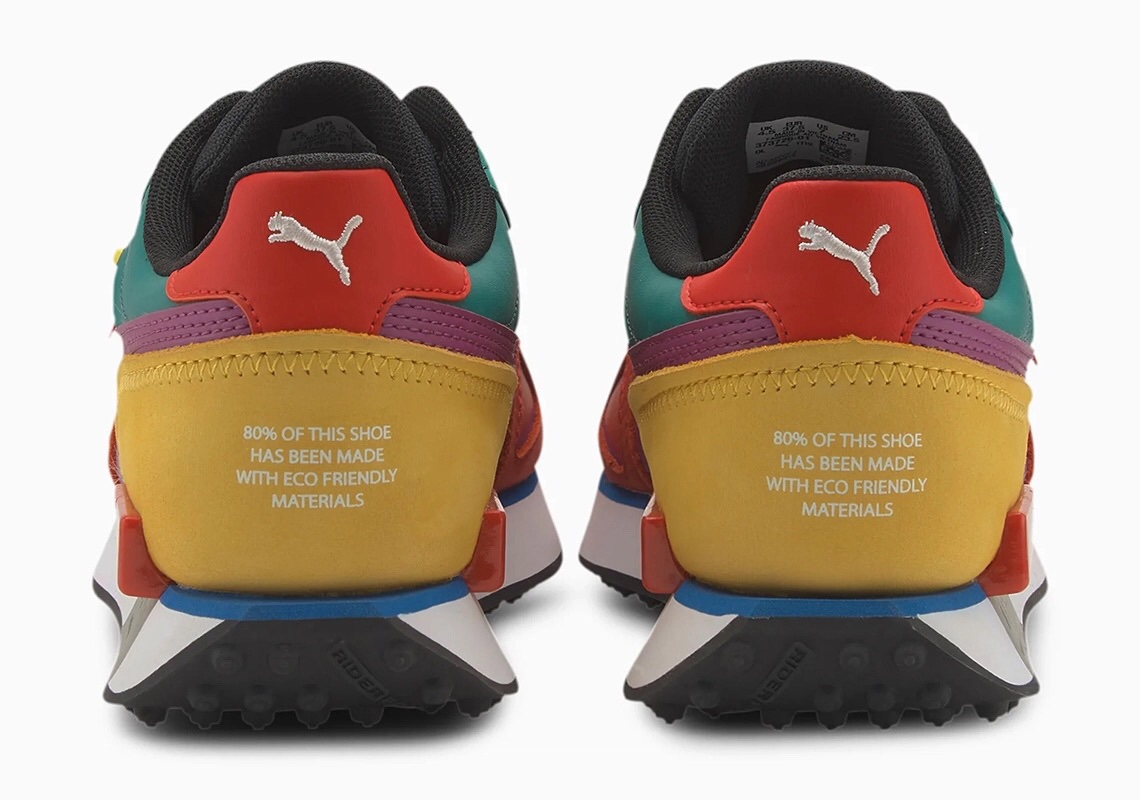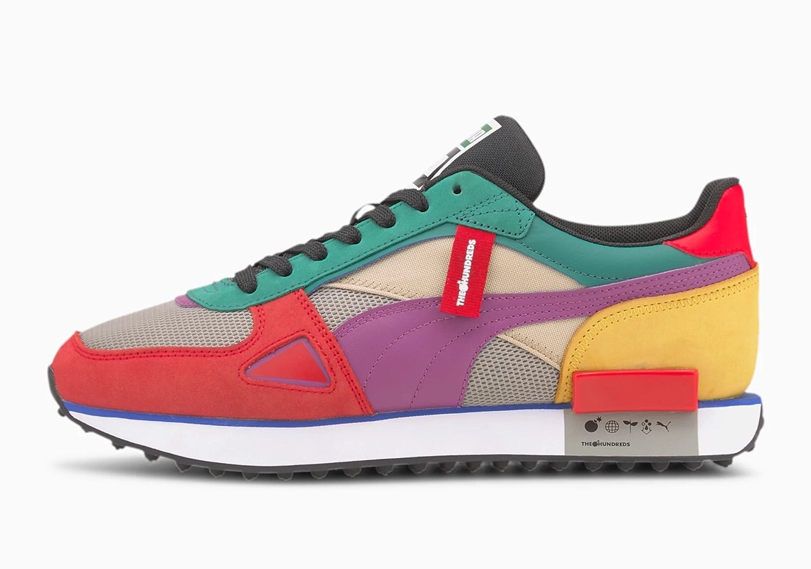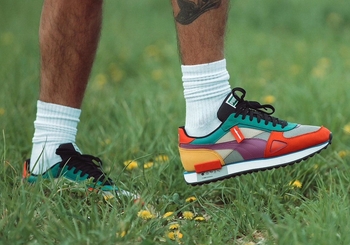 Puma is currently linking up with LA based streetwear brand The Hundreds to create a sustainably based Puma Future Rider collaboration. It is designed to increase awareness around our environmental impact. The upper is made of eco-friendly materials such as recycled mesh and rubber. Playful color arrangement which include nurse scrub green base layers and overlays near the ankle. Suede panel also alternate between yellow in the rear and orange at the toe tips. The midsoles are adorned with Bobby Hundred’s signature bomb logo, PUMA insignia and “Go Green”. The heels also features some keyword which means these shoes are made of 80% recycled materials to further emphasize the earthy motif. It will be available on September 26th with the price tag of USD 120.