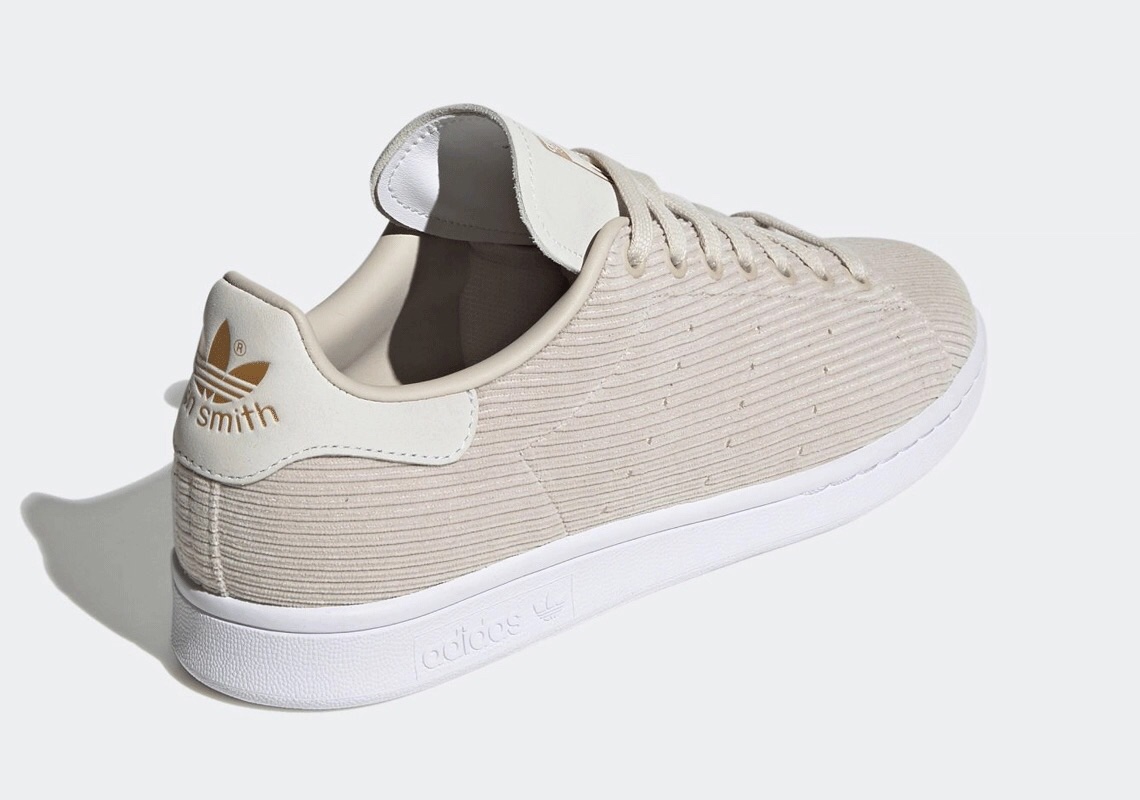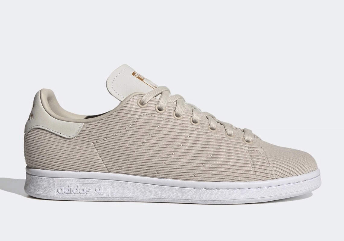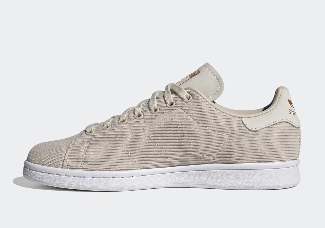 Adidas Stan Smith has emerged in corduroy construction. It is clad in shades of “Clear Brown”. The upper features the textured fabric from forefoot to rest. Heel overlays indulge in a leather makeup just as the tongues. The standard branding boasts “Gold Metallic” to make any muted autumnal outfit pop. The underfoot sole unit opt for “”Footwear White” composition. It is going to release real soon. Stay tuned to their release day.