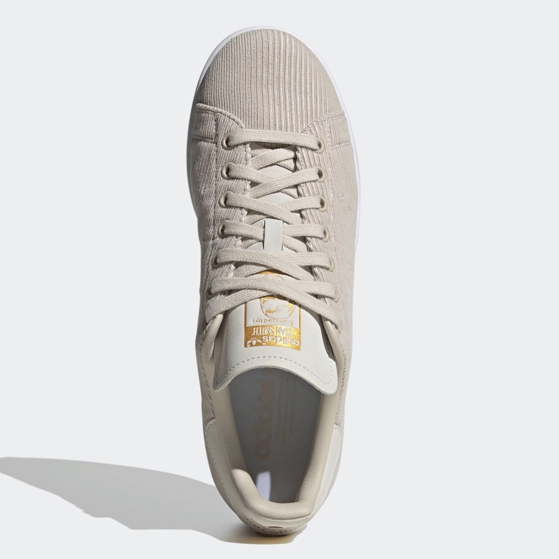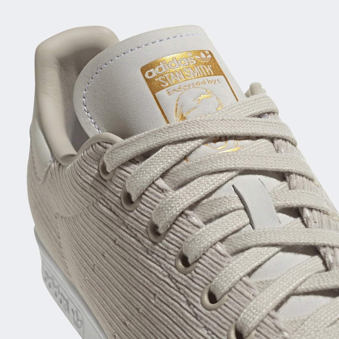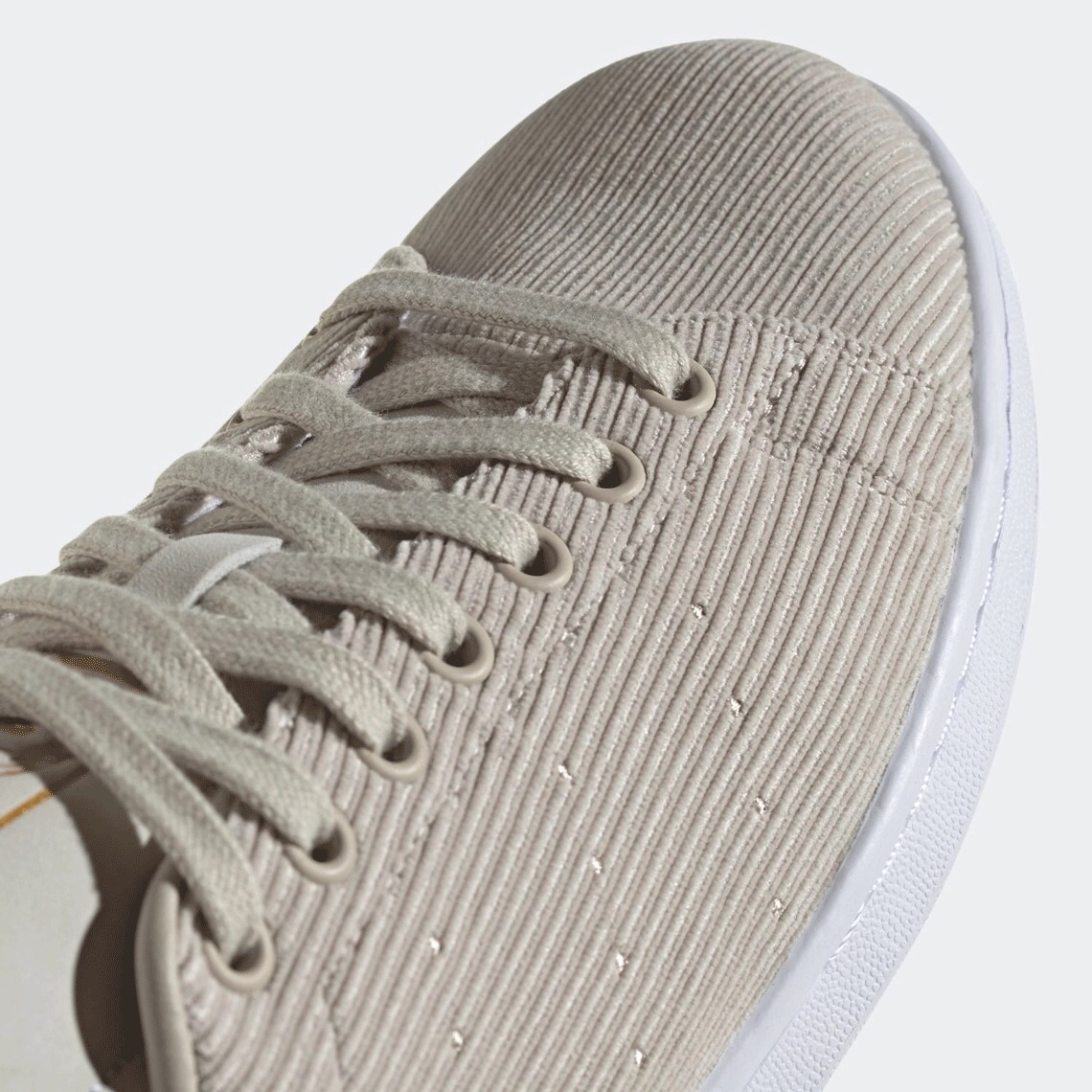 Adidas Stan Smith has emerged in corduroy construction. It is clad in shades of “Clear Brown”. The upper features the textured fabric from forefoot to rest. Heel overlays indulge in a leather makeup just as the tongues. The standard branding boasts “Gold Metallic” to make any muted autumnal outfit pop. The underfoot sole unit opt for “”Footwear White” composition. It is going to release real soon. Stay tuned to their release day.