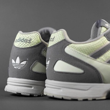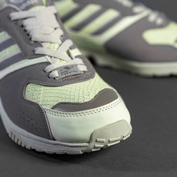 Adidas has reignited faith in ZX which features glowing snakeskin upper. The overlays and Three Stripes are hued in dark grey, most of the construction is in snakeskin texture. The scales impart visual can be found along the toe box, mid and and all doused in fluorescent green like leather accents. All these fixtures can glow in the dark once the lights are off.
